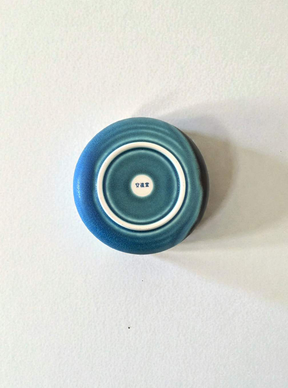 - Finish: Glossy speckled blue glaze with a bold, reactive dark sweep on the rim.